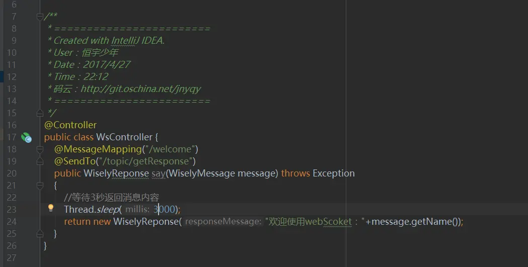 我们添加一个名叫WsController的控制器并添加对应的@MessageMapping注解开启WebSocket的访问地址映射,如下图5所示: