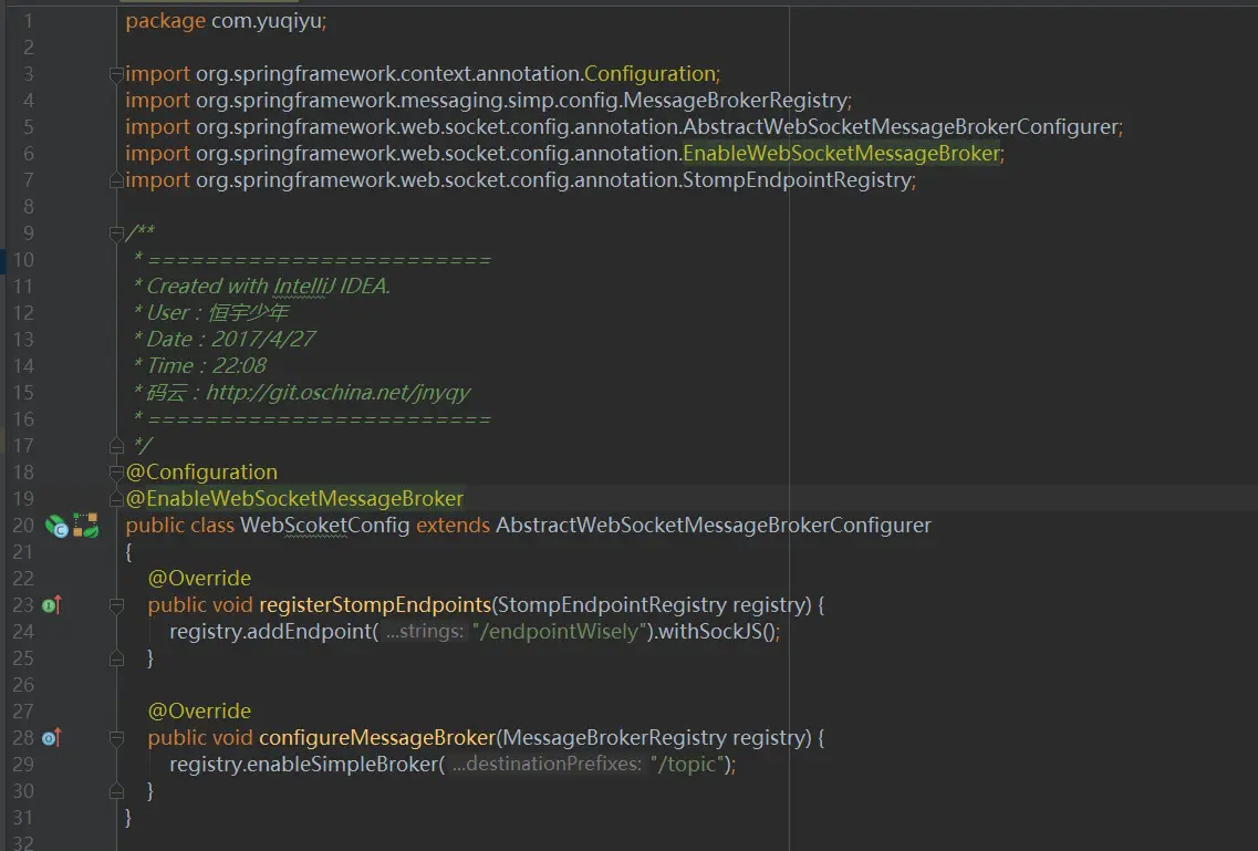 下面我们创建一个WebSocketConfig配置类,添加SpringBoot项目对WebSocket的支持配置,如下图2所示: