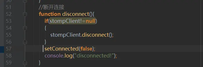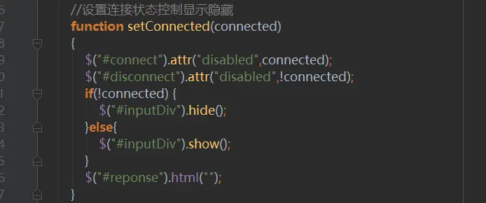 可以看到我们通过SockJs来注册了endpoine,并且通过客户端开启通过连接,连接成功后调用setConnected方法来修改界面的元素显示隐藏,如下图8所示: