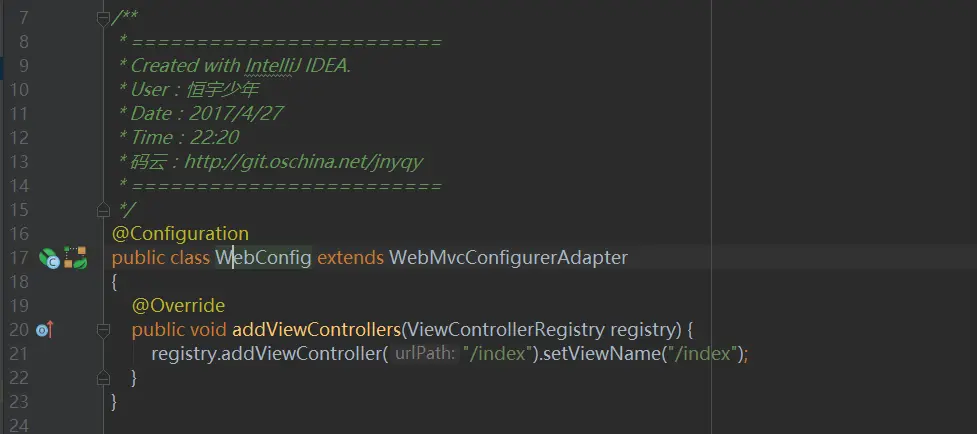我们创建一个名叫做WebConfig的配置类并继承WebMvcConfigurerAdapter,实现addViewControllers方法添加对应的路径映射配置,如下图13所示: