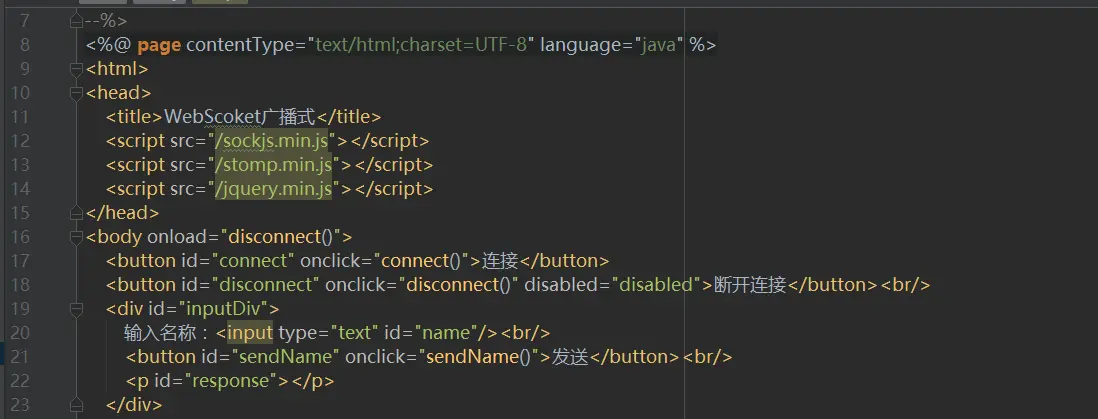 在编写对应的代码之前,我们需要下载三个js文件,分别是:jquery.min.js、sockjs.min.js、stomp.min.js,在本章源码的resources/statis目录下(文章源码在本文最后)。Jsp代码如下图6所示: