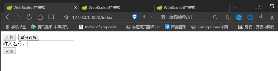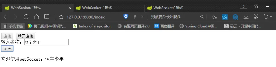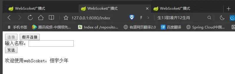 点击《发送》按钮后等待3秒钟后,界面会输出欢迎的字样,证明我们的WebSocket通道已经成功的接通并且获取到了服务端返回到浏览器的数据,下面我们打开多个浏览器Tab来测试广播式的消息是否可以发送到多个开启WebSocket通道的浏览器中。