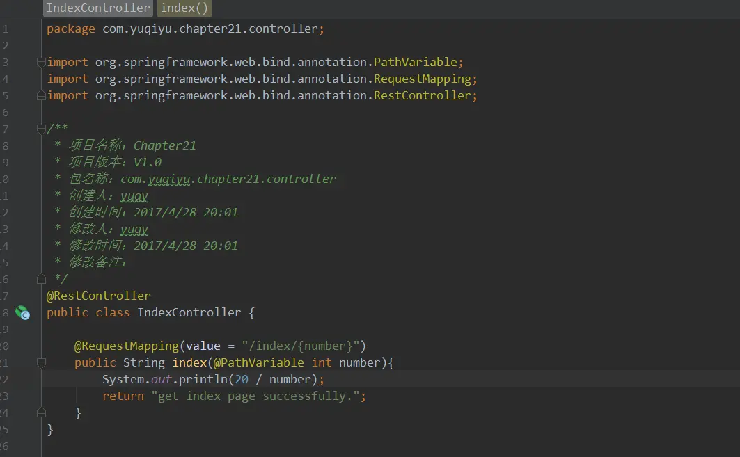 可以看到上图3内,我们的请求路径是/index/{number},这个number就是对应int number的值,我们输出20/number时,如果number = 0,那么就会出现RuntimeException。在测试代码之前我们需要添加一个固定返回Json的实体类ApiResult。