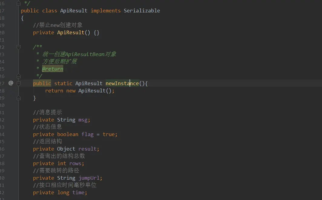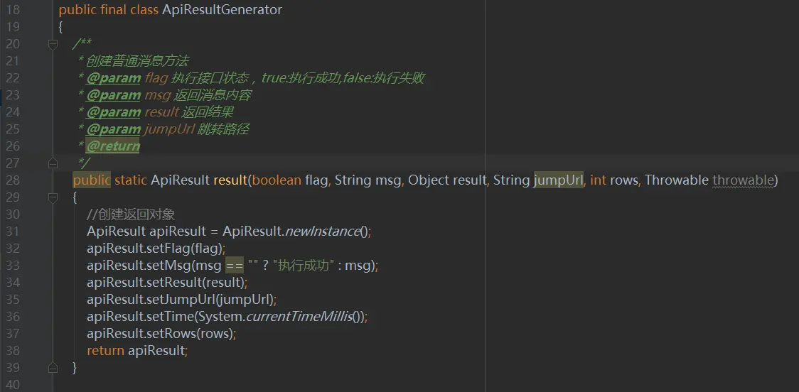 这个只是一个返回对象,我们将这个类的构造函数私有化了,所以我们在外部不能直接使用new的方式创建对象,我们提供了一个newInstace方法来实例化ApiResult并获取对象。下面我们创建一个ApiResultGenerator用来生成ApiResult不同状态的返回内容(成功、失败)。