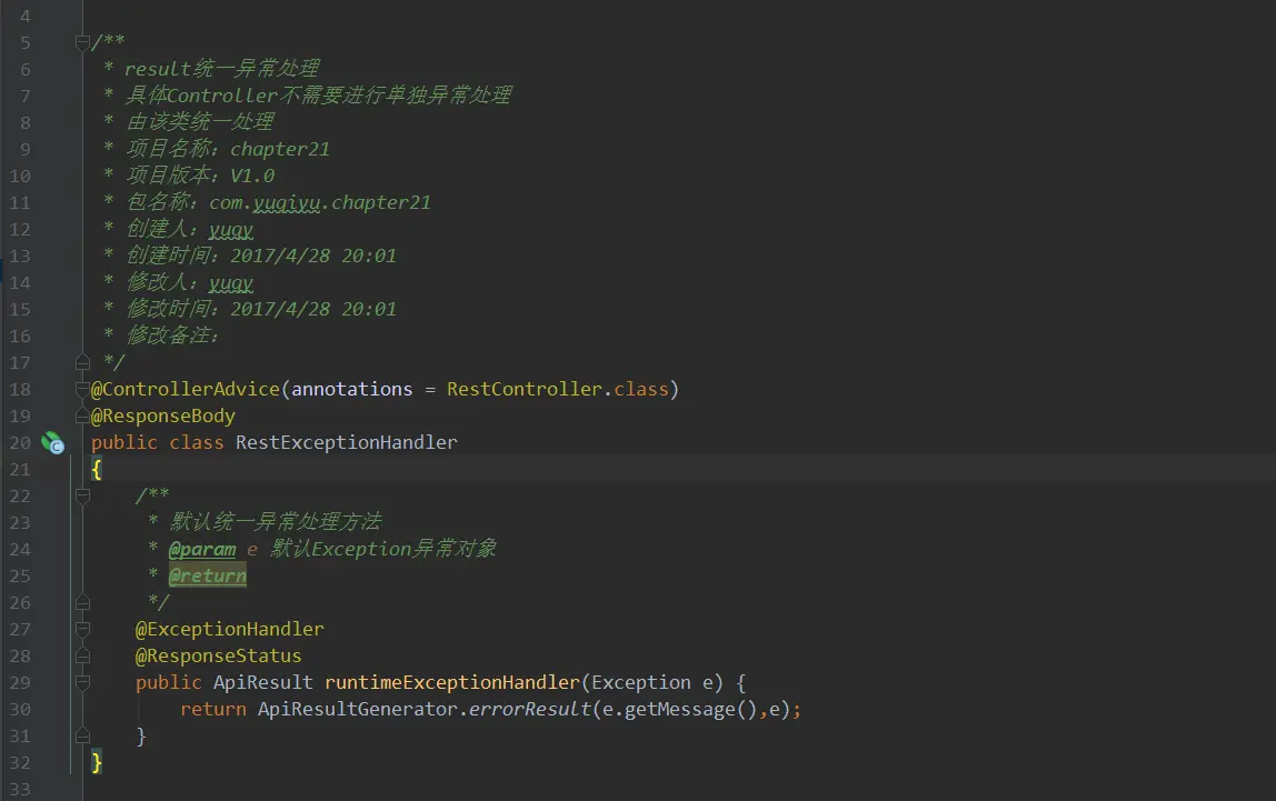 顾名思义,@ControllerAdvice注解是用来配置控制器通知的,我们可以配置过滤拦截具体一种或者多种类型的注解,添加annotations属性即可,因为我们全局返回的都是Json格式的字符串,所以需要再类上配置@ResponseBody注解,该注解熟知SpringMvc的开发人员都知道就不做过多的解释了,RestExceptionHandler全局处理类代码如下图2所示: