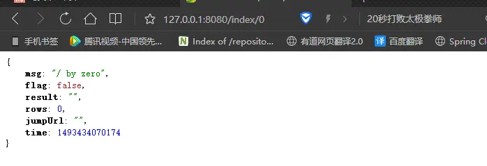 上图9的内容是我们格式化ApiResult类后的Json字符串,可以看到给我们返回了错误消息以及对应的参数标识,证明我们配置的全局异常已经生效,当我们传入number = 0时,肯定会出现运行时的被除数不可以为0的异常,所以SpringBoot内置SpringMVC会通过检查是否配置全局异常来处理视图的返回内容。