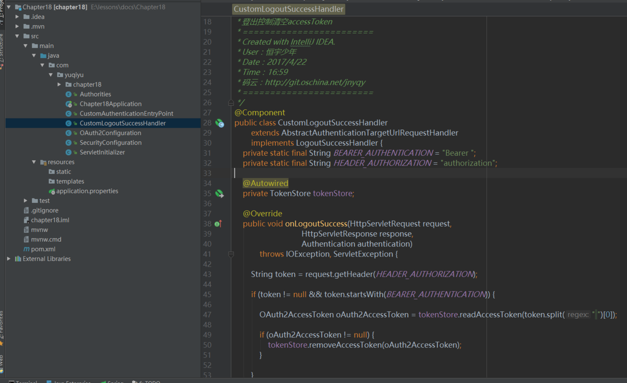 当我们退出系统时需要访问SpringSecrutiy的logout方法来清空对应的session信息,那我们退出后改用户的access_token还依然存在那就危险了,一旦别人知道该token就可以使用之前登录用户的权限来操作业务。logout控制代码如下图22所示: