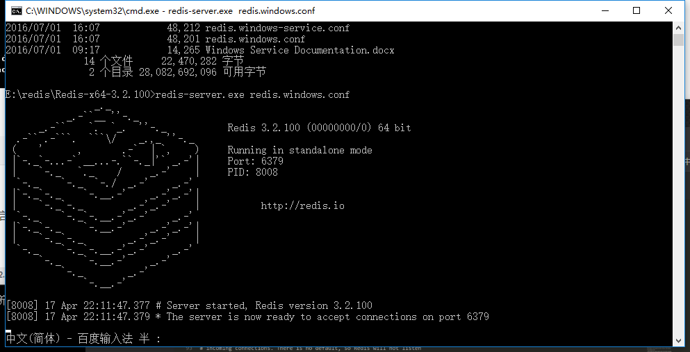 如果没有端口没有被占用,我们需要在cmd命令窗口执行运行Redis,我们首先使用cmd命令进入到Redis解压目录并且执行redis-server.exe redis.windows.conf命令即可,如下图4所示: