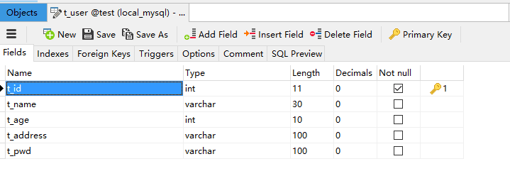 我们现在我们本地的MySQL数据库内创建一张表结构,如下图10所示: