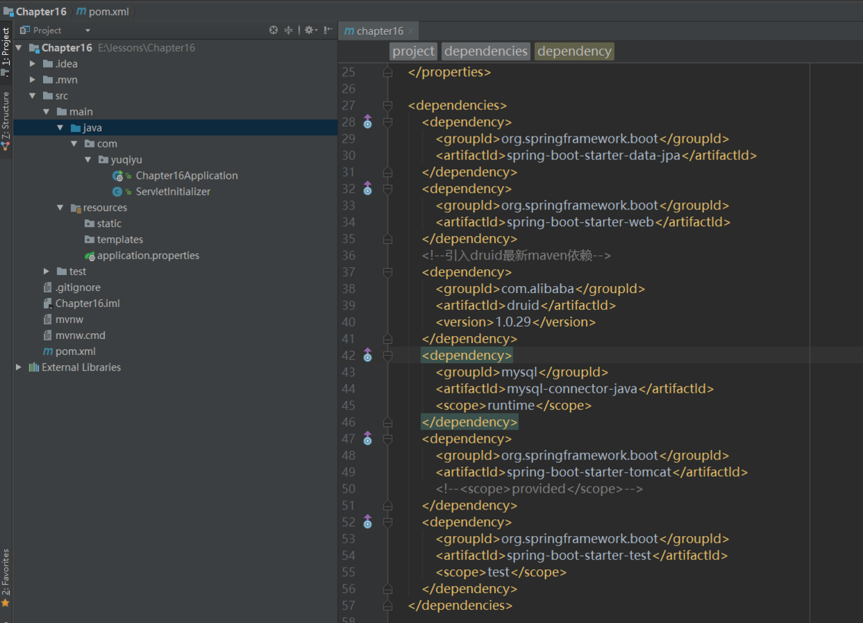 接下来复制第十三章:SpringBoot实战SpringDataJPA文章项目源码(源码地址:git.oschina.net/jnyqy/lesso…)的application.yml配置文件到本章节项目的resources目录下,如下图6所示: