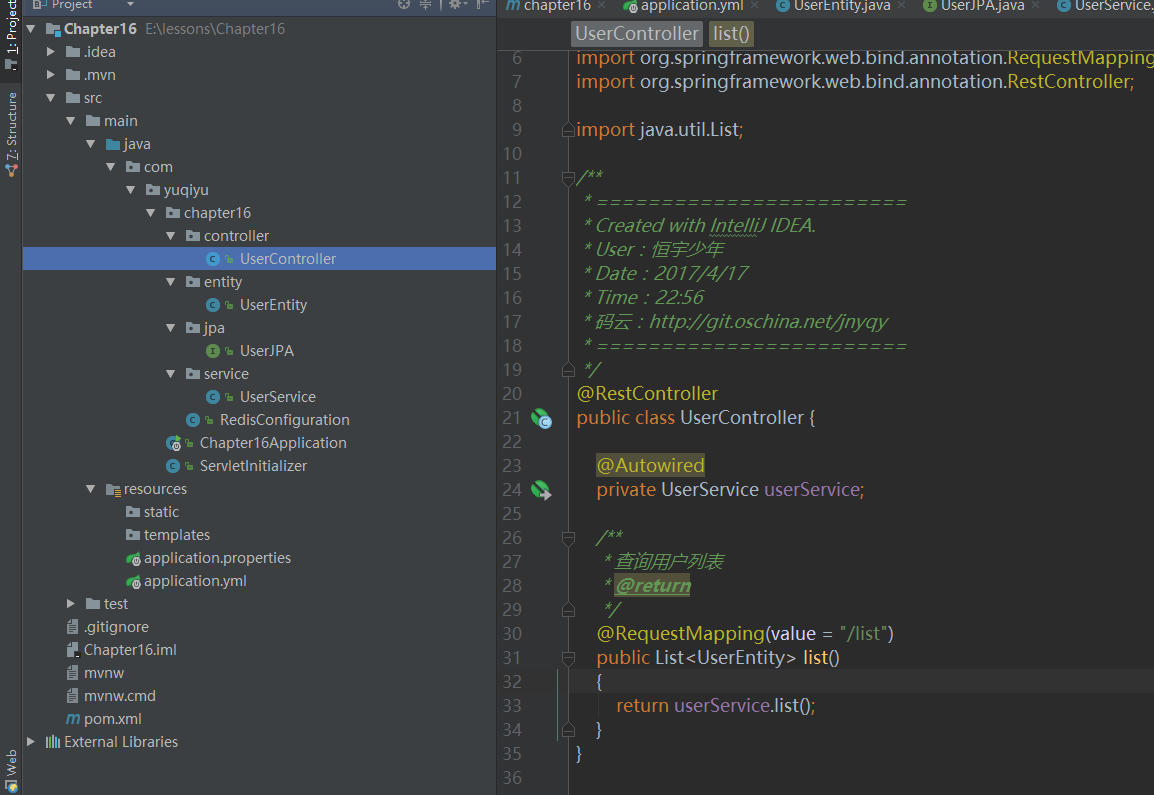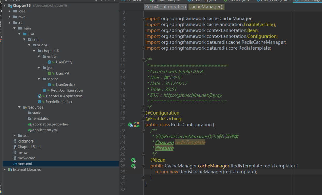 创建JPA完成后,我们对应的创建一个业务逻辑服务类:UserService,我们在Service内添加redis的缓存支持,如下图13所示: