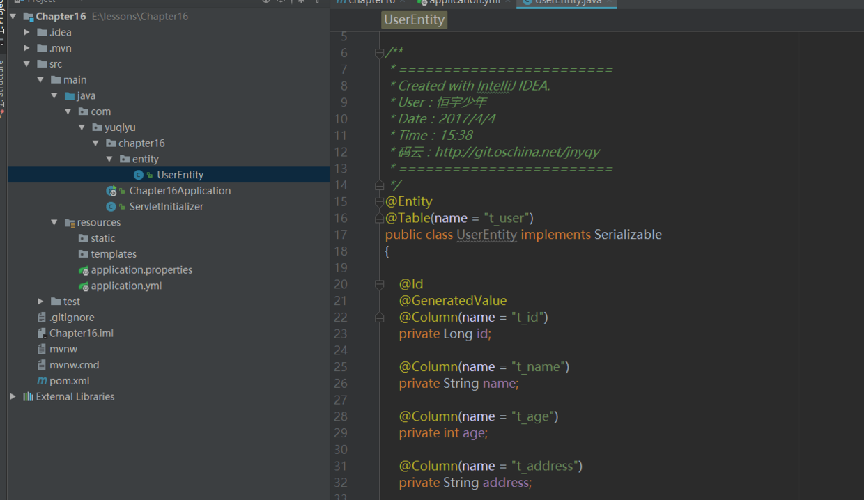 表内就是几个简单的测试字段,下面我们根据对应的字段创建UserEntity,代码如下图11所示: