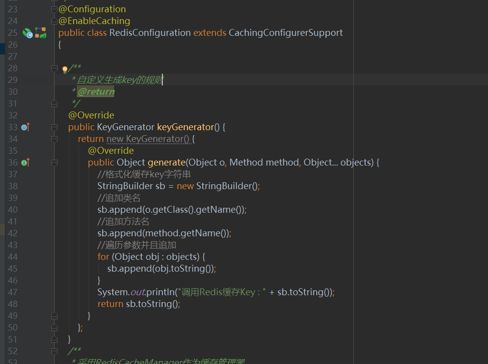 我们打开RedisConfiguration配置类,添加继承CachingConfigurerSupport类,并重写方法keyGenerator(),代码如下图20所示: