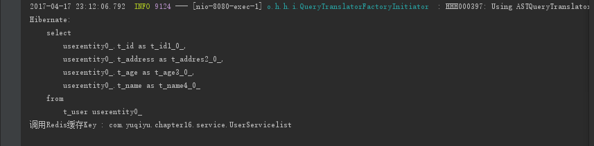 可以看到只有一次输出,这个输出还是我们上次访问的时候执行的,证明我们配置的Redis缓存已经生效,下面我们使用Redis的客户端来查看下是否已经存在。
