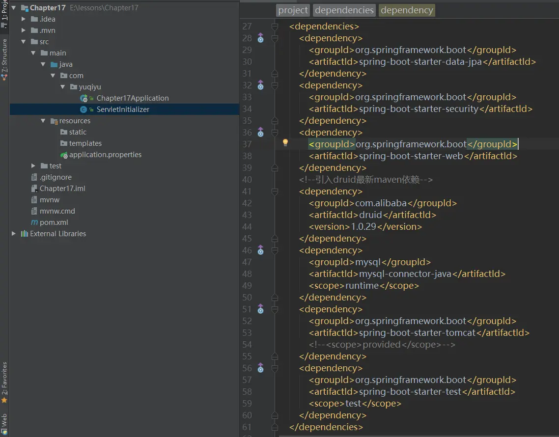 我们使用IntelliJ IDEA工具创建一个SpringBoot项目,预先加入JPA、Security、Druid、MySQL等依赖,项目结构如下图1所示: