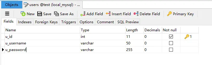 数据库连接配置完成后,我们开始创建本章需要用到的三张表,用户表、角色表、用户角色关联表,一个用户存在多个角色!用户表结构图下图3所示: