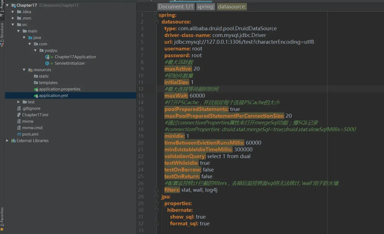 我们下面先来配置数据库访问的配置,将我们之前章节(第十三章:SpringBoot实战SpringDataJPA)的application.yml配置文件复制到本章项目resources目录下,如下图2所示: