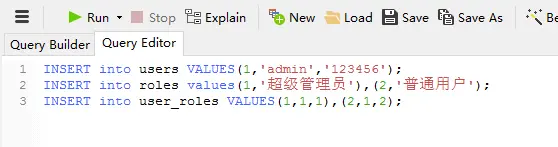 我们对用户表、角色表、关联表添加几条对应的数据,SQL脚本如下图8所示: