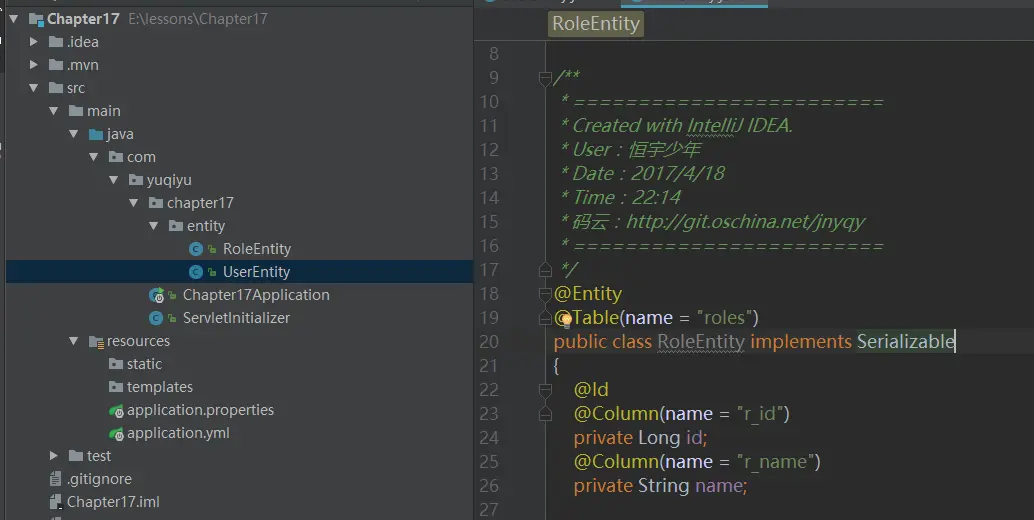 可以看到我们的用户实体内添加了对角色的列表支持,并添加了@ManyToMany的关系注解。我们查询用户时SpringDataJPA会自动查询处关联表user_roles对应用户的角色列表放置到名叫roles的List集合内。