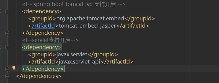 我们这里配置了登录页面127.0.0.1:8080/login请求地址以及登录错误页面/login?error不被SpringSecurity拦截。下面我们来编写登录的JSP页面,我们之前构建项目的时候并没有添加JSP的依赖,下面我们修改pom.xml添加JSP依赖,如下图13所示: