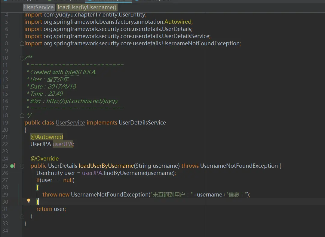 可以看到上图10内的定义,实现UserDetailsService接口需要完成loanUserByUsername重写,我们使用UserJPA内的findByUsername方法从数据库中读取用户,并将用户作为方法的返回值。