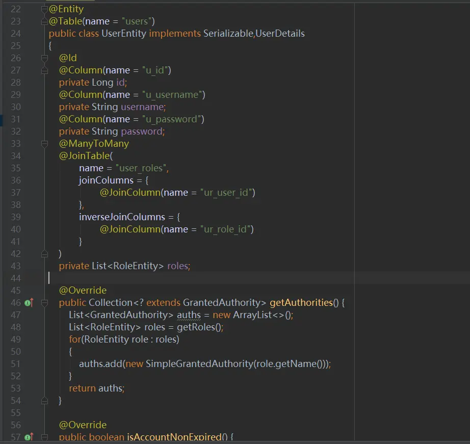 可以看到我们的UserEntity实现了UserDetails接口,UserDetails是SpringSecurity验证框架内部提供的用户验证接口(我们下面需要用到UserEntity来完成自定义用户认证功能),我们需要实现getAuthorities方法内容,将我们定义的角色列表添加到授权的列表内。