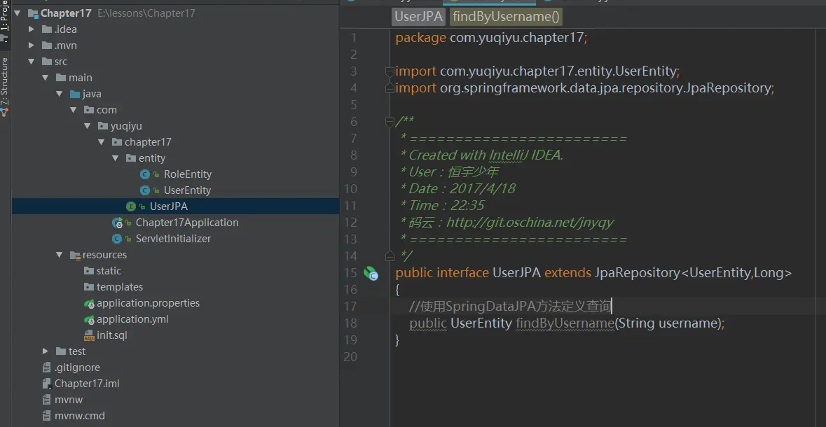 我们可以看到我在图9的UserJPA接口内添加了一个findByUsername方法,这个方法其实是SpringDataJPA的一个规则,我们这样写JPA就会认为我们要根据username这个字段去查询,并自动使用参数索引为0的值(有关SpringDataJPA方法查询后期会在SpringDataJPA 核心技术内体现)。
