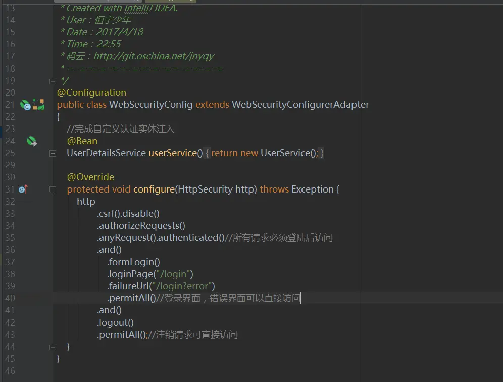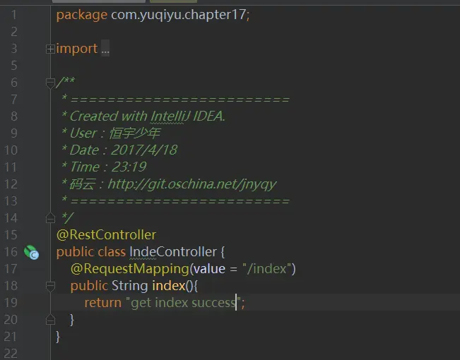上面有关SpringSecurity配置都已经完成,接下来我们添加一个IndexController来测试我们的SprinySecurity框架是否已经生效,我们上面已经配置了,如果在不登陆的状态下只有/login是可以访问的,所以我们直接访问/index是不可行的。SpringSecurity会直接给我们重定向到我们配置的loginPage,IndexController代码如下图17所示: