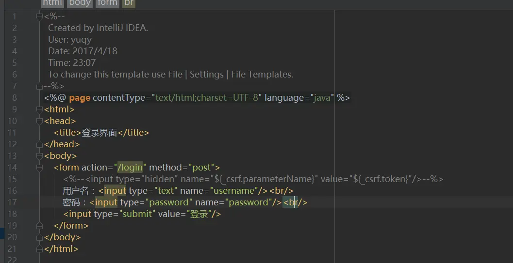 好了,下面我们简单的创建一个login.jsp页面,页面里面添加一个简单的表单提交,我们的表单提交地址这里要注意了,SpringSecurity内部已经给我们定义好了,在4.0版本之后登录地址都是/login,当然这个/login并不是我们上面配置的loginPage地址。这个地址如果直接访问是访问不到的。必须采用Post形式访问,login.jsp页面内容如下图15所示: