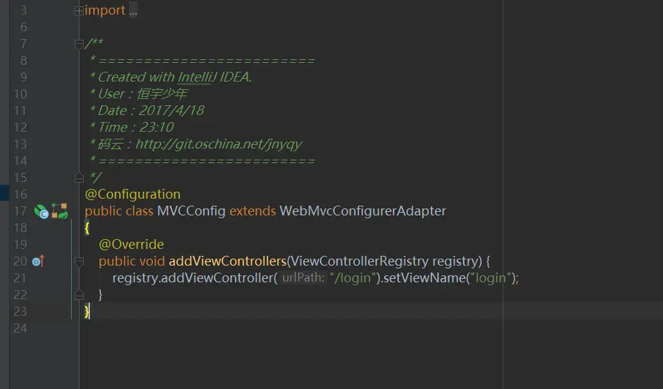 我们来配置一个简单的SpringBoot内的MVC控制器跳转,下面我们添加一个名叫MVCConfig配置类继承WebMvcConfigurerAdapter类,重写addViewControllers()方法添加路径访问,可以通过Get形式的/login访问到我们的login.jsp,代码如下图16所示: