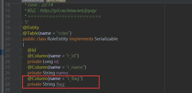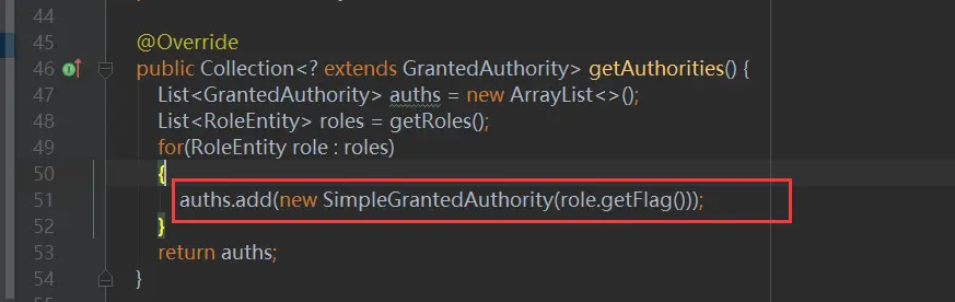 还有最重要的一点,我们的UserEntity内是根据RoleName来添加角色授权的,下面我们需要改成flag,如下图25所示: