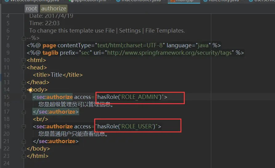 下面我们创建main.jsp,在jsp页面引入SpringSecurity标签库,并根据角色判断输出内容,如下图21所示:
