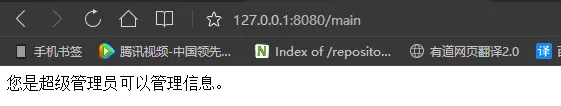 我们在main.jsp判断了是超级管理员、普通用户的角色并根据不同的角色输出不同的内容,下面我们重启项目访问127.0.0.1:8080/main地址查看界面输出内容,如下图22所示: