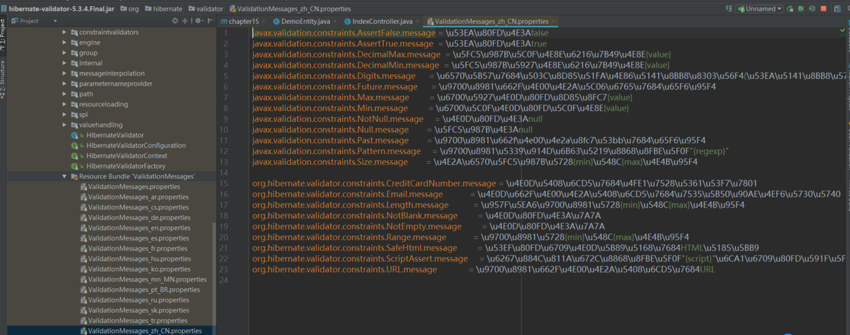上图4可以看到我在控制器中注入了一个MessageSource的接口对象,这个对象是用于格式化错误消息的。根据传入的错误字段对象(FieldError)结合hibernate-validator验证的内置错误消息文件进行输出错误消息,hibernate-validator的错误消息支持国际化,所以我们获取错误消息的时候需要传入Locale对象获取本地的国际化类型。hibernate-validator错误消息文件在对应源码包内可以找到,内容如下图5所示: