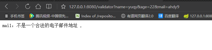 可以看到SpringBoot内的验证起作用了,我们访问地址的时候并没有传入任何的参数,所有的错误消息都一并输出了,那我们尝试传入name、age有效数据,mail数据填写错误邮箱地址,效果如下图7所示: