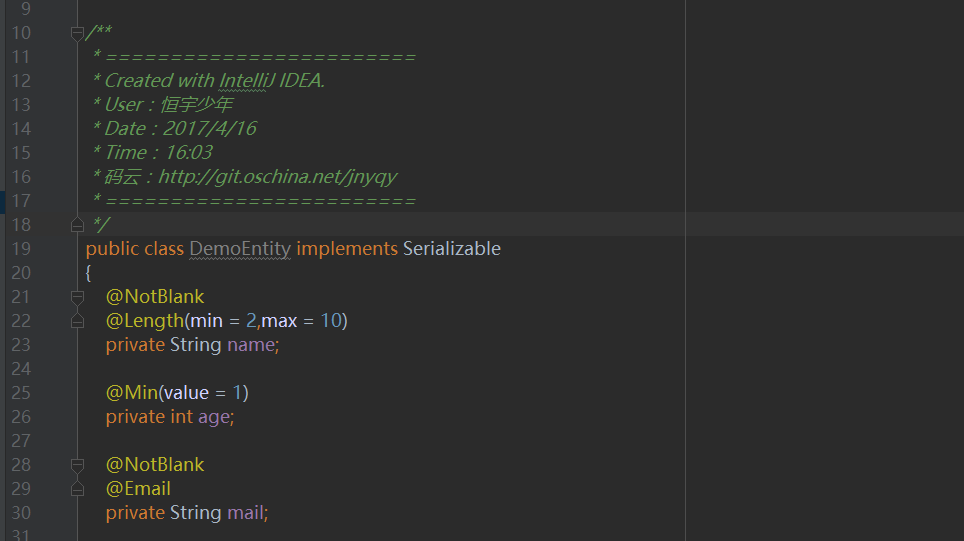 我们接下来创建一个实体叫做DemoEntity,实体内添加几个测试字段并对每个字段都做出验证处理,代码如下图3所示: