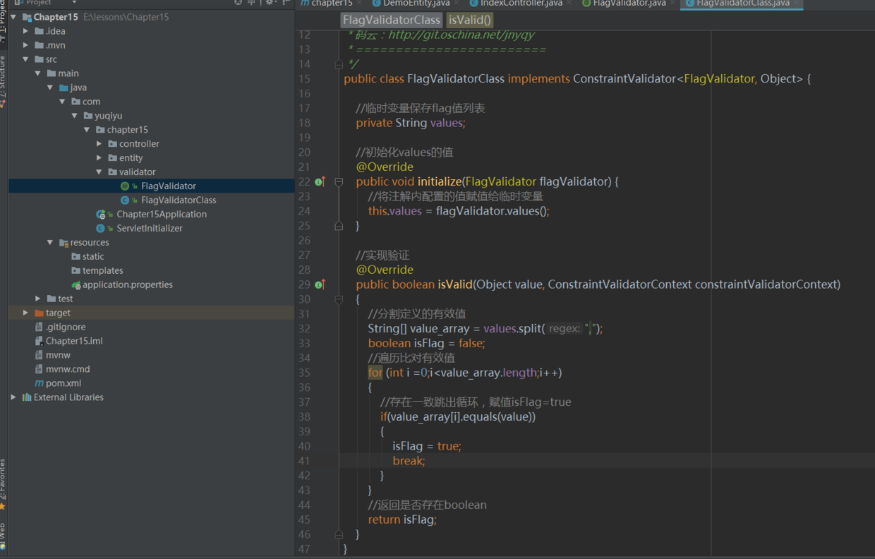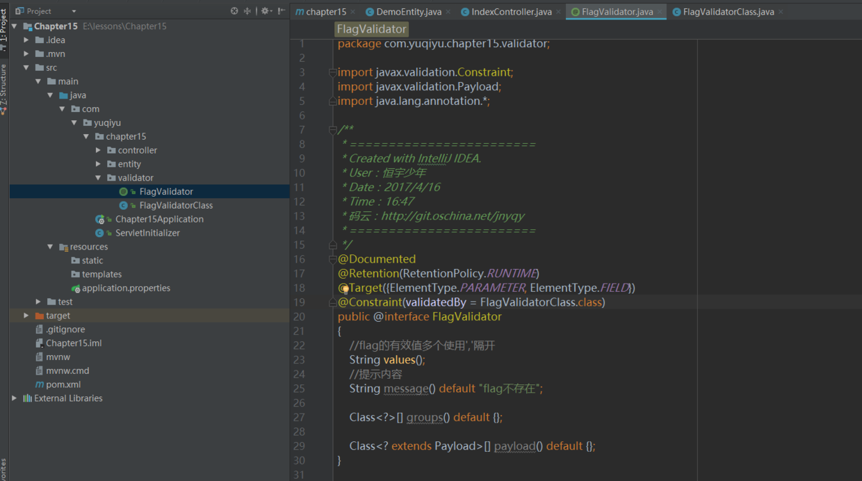 我们先来修改DemoEntity实体类,加入flag字段并且配置@FlagValidator自定义注解,如下图11所示: