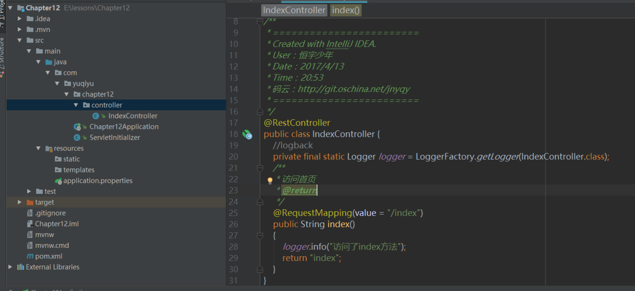 可以看到我们屏蔽了com.yuqiyu.chapter12.controller包下的日志打印,为了方便测试我们在com.yuqiyu.chapter12包下创建一个名叫TestController的控制器并复制IndexController的没内容如下图9所示: