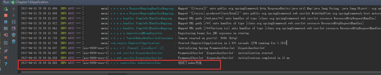 下面我们来启动项目,访问地址127.0.0.1:8080/index,查看控制台的输出效果,如下图3所示: