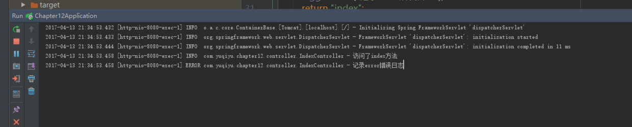 我们再来重启下项目,访问127.0.0.1:8080/index地址后再查看下控制台以及日志文件内是否存在日志信息,如下图10所示: