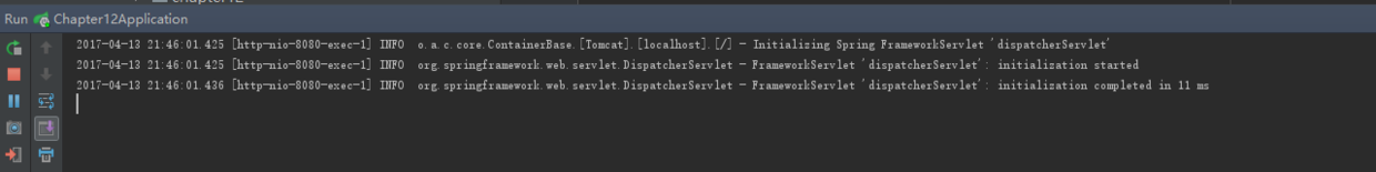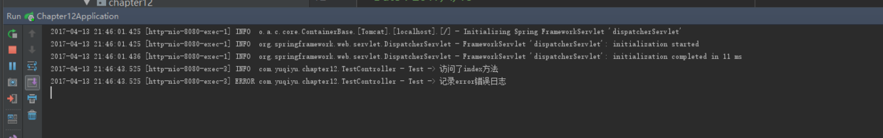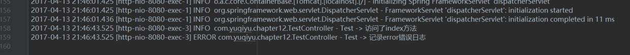 控制台并没有打印任何的日志,日志文件中也是如此!我们再来访问下127.0.0.1:8080/test地址,查看控制台以及日志文件内容,如下图11、12所示: