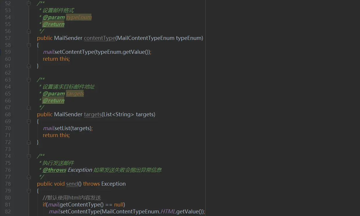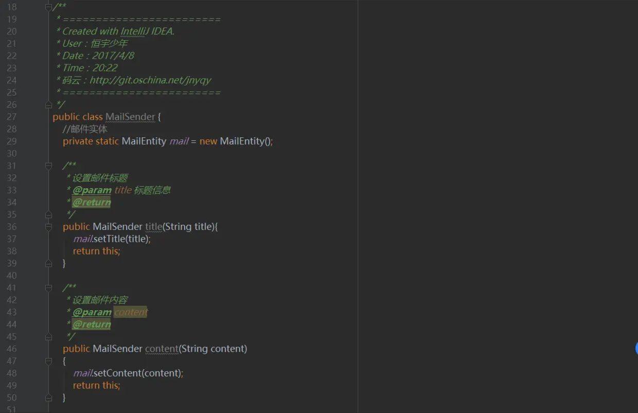 我们的MailEntity包含了上图3的字段内容,都是一些必填选项,下面我们来创建一个MailSender也就是邮件发送者实体,主要作用就是用来配置发送邮件参数以及执行发送邮件,代码如下图4、5、6、7、8所示: