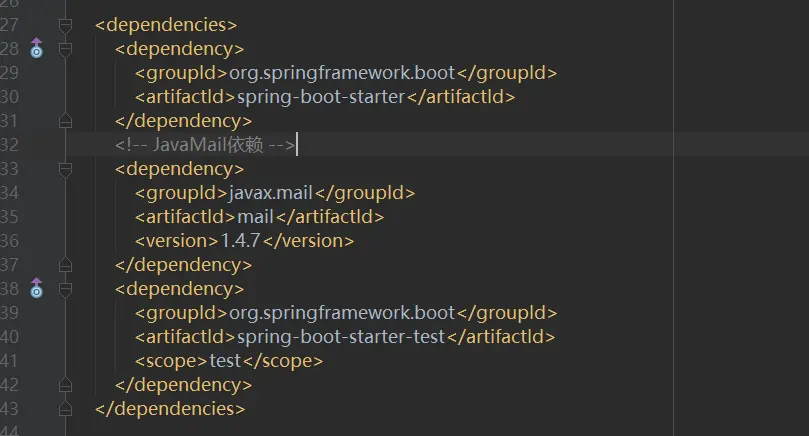 可以看到上图1内容,多余的依赖并没有添加,如果你选择的是War项目也没有关系名,那好,我们接下来把我们的主角JavaMail请出来吧,把对应的依赖添加到pom.xml配置文件内。如下图2所示: