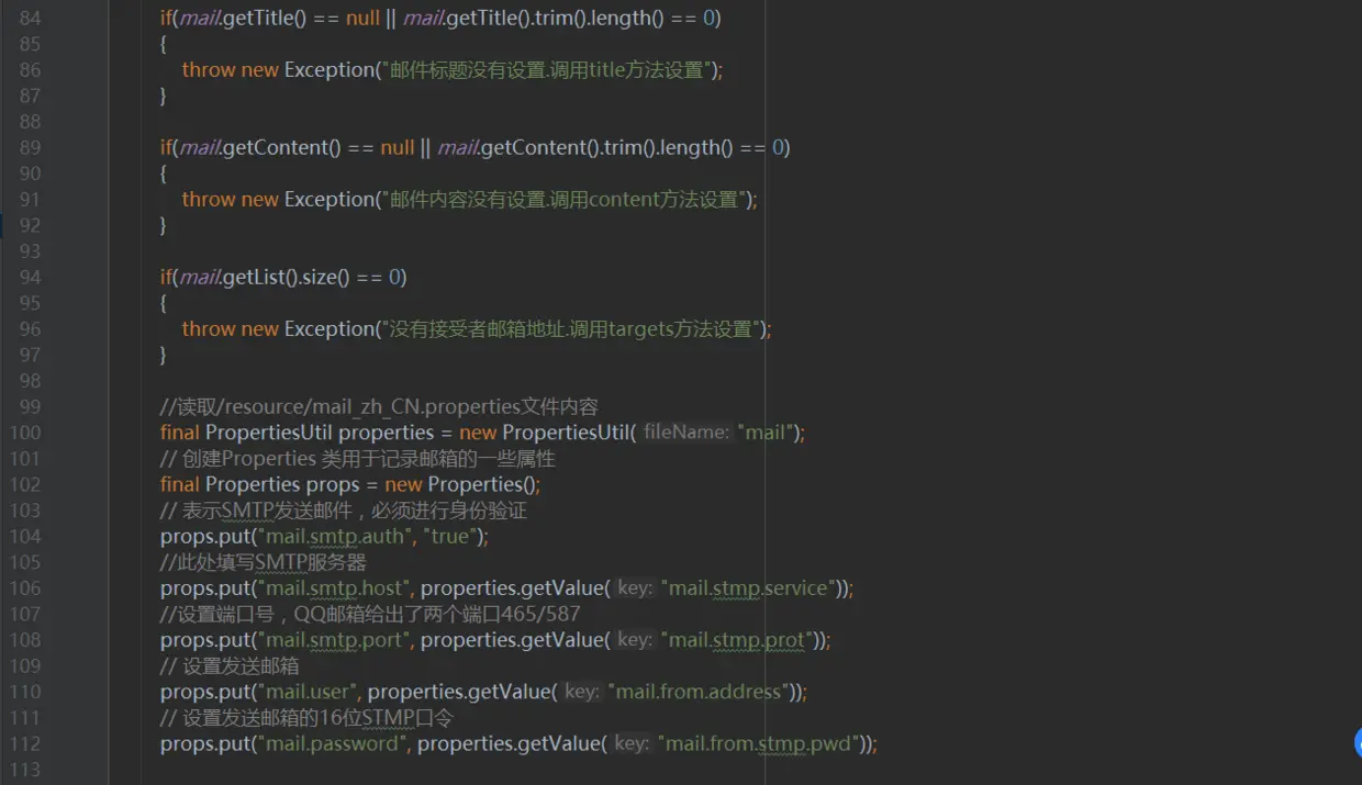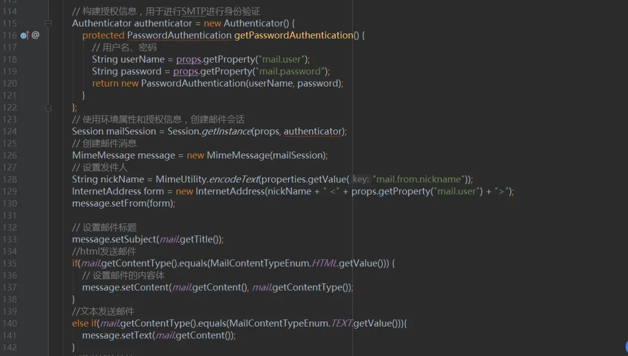 因为简书的富文本编辑器不支持代码块,下次编写文章使用MarkDown方式来写,类过长贴起来图挺费劲。上面可以看到我使用到了MailContentTypeEnum以及PropertiesUtil工具类。