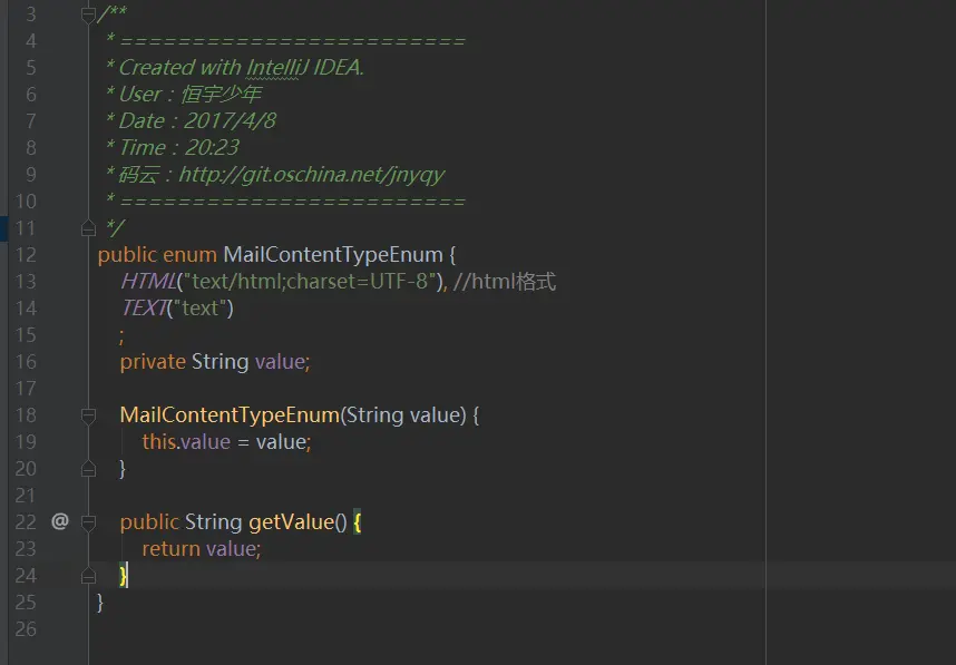 这是一个我自定义的枚举类型,枚举类型包含了邮件内容的类型,目前我仅仅添加了两种,一种是html另外一种则是text形式,具体代码如下图9所示: