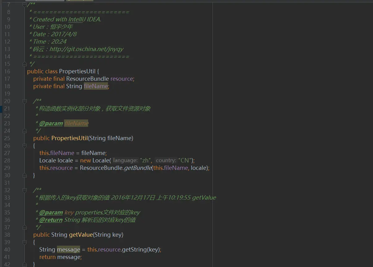PropertiesUtil是用于读取*.properties配置文件的工具类,使用JavaMail需要配置SMTP以及用户名、密码等也就是MailEntity内的字段,那么我们在/resource目录下创建一个名字叫mail.properties的配置文件,里面存放我们定义的邮件发送参数配置,这样方便修改,我分别贴出PropertiesUtil、mail.properties代码内容,如下图10、图11所示: