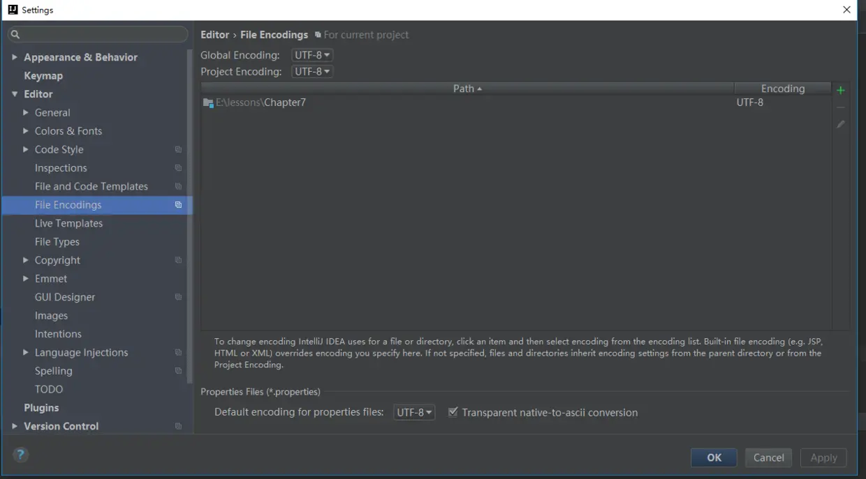 第一步:修改InteiiJ IDEA工具的properties文件的编码,点击File->Setting->Editor->File Encodings将下面的Default encoding设置为UTF-8,如下图16所示: