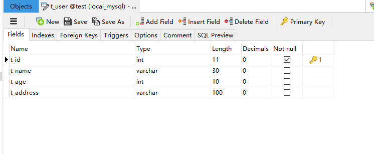 上述数据配置文件已经完成,接下来我们新建数据库测试表结构我使用的数据库工具是Navicat你们可自行下载或者使用其他工具,结构如下图7所示: