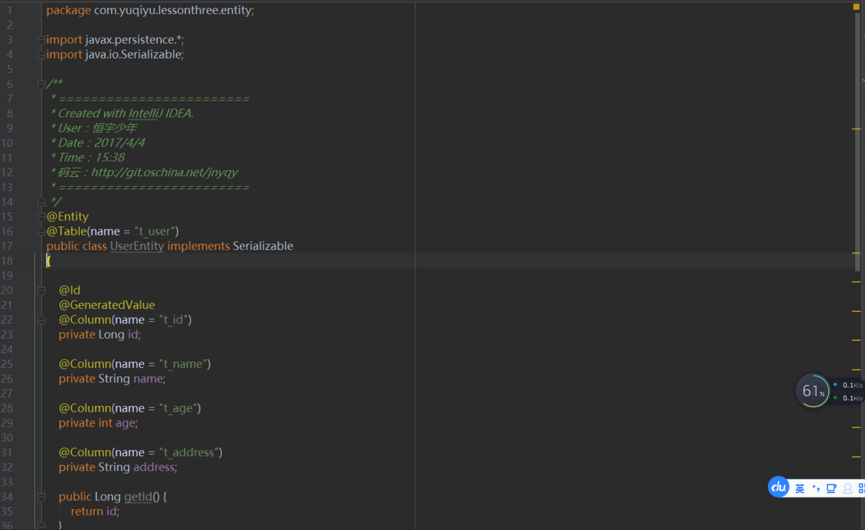我们根据数据库中的字段对应创建一个UserEntity来作为对应操作,如下图9所示: