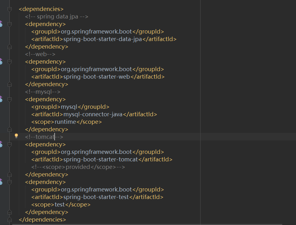 我们打开pom.xml可以看到springboot自动为我们添加了spring-data-jpa、mysql-connector-java的支持,如下图5所示: